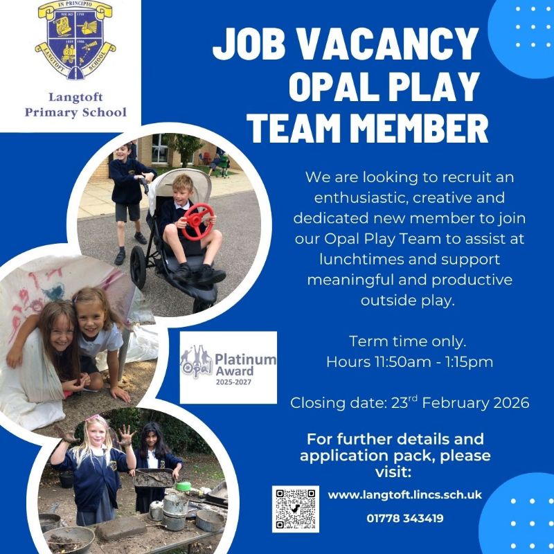 We are looking to recruit an enthusiastic, creative and dedicated new member to join our Opal Play Team to assist at lunchtimes and support meaningful and productive lunchtime play.